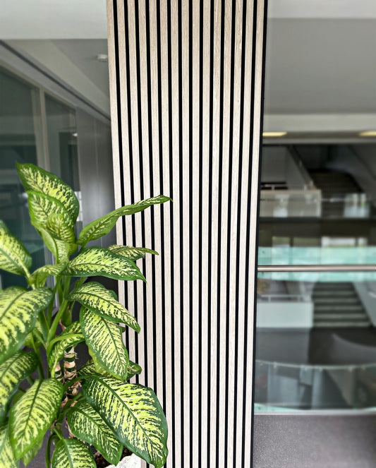 Akustiikkapaneelit ovat ihanteellisia käytettäväksi tiloissa, joissa kaiku aiheuttaa ongelmia. Huopapohjainen akustinen suodatin imee ääniaallot ja rimamuoto ei heijasta ääntä takaisin tilaan.